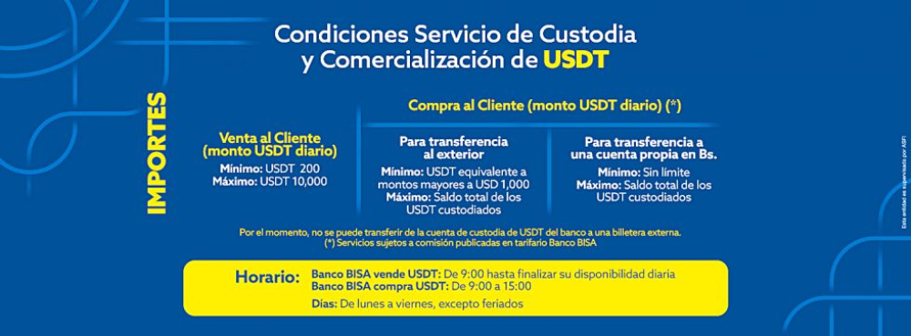 LÍMITES. El monto mínimo de compra es de 200 USDT y el máximo diario permitido es de 10.000 USDT, sin que esta operación genere ningún costo para los clientes; sin embargo, al realizar una venta, las transacciones de hasta 5.000 USDT tienen un costo de Bs 35, mientras que para montos superiores a 5.000 USDT, el costo asciende a Bs 100.