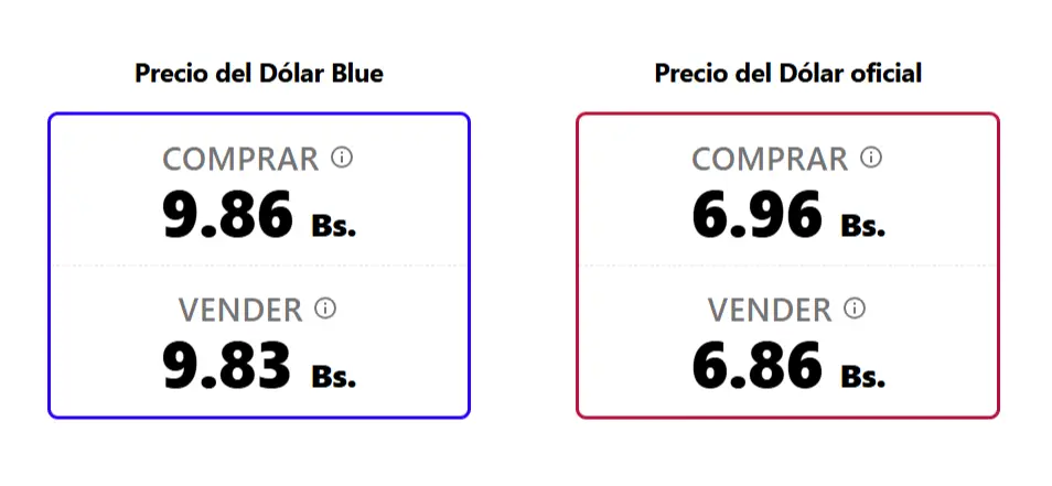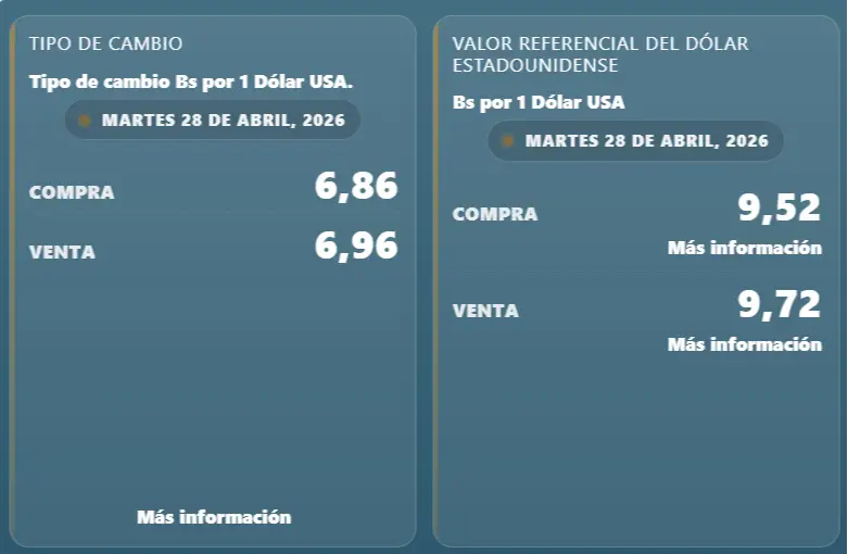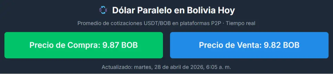 Por su parte, el sitio bolivianblue.net, que actualiza sus datos cada 15 minutos, reporta que la divisa se ubica en Bs 9,86 para la compra y Bs 9,83 para la venta. En su registro del cierre del lunes, el portal señalaba Bs 9,87 para la compra y Bs 9,83 para la venta, lo que muestra un ascenso significativo en la cotización de compra.