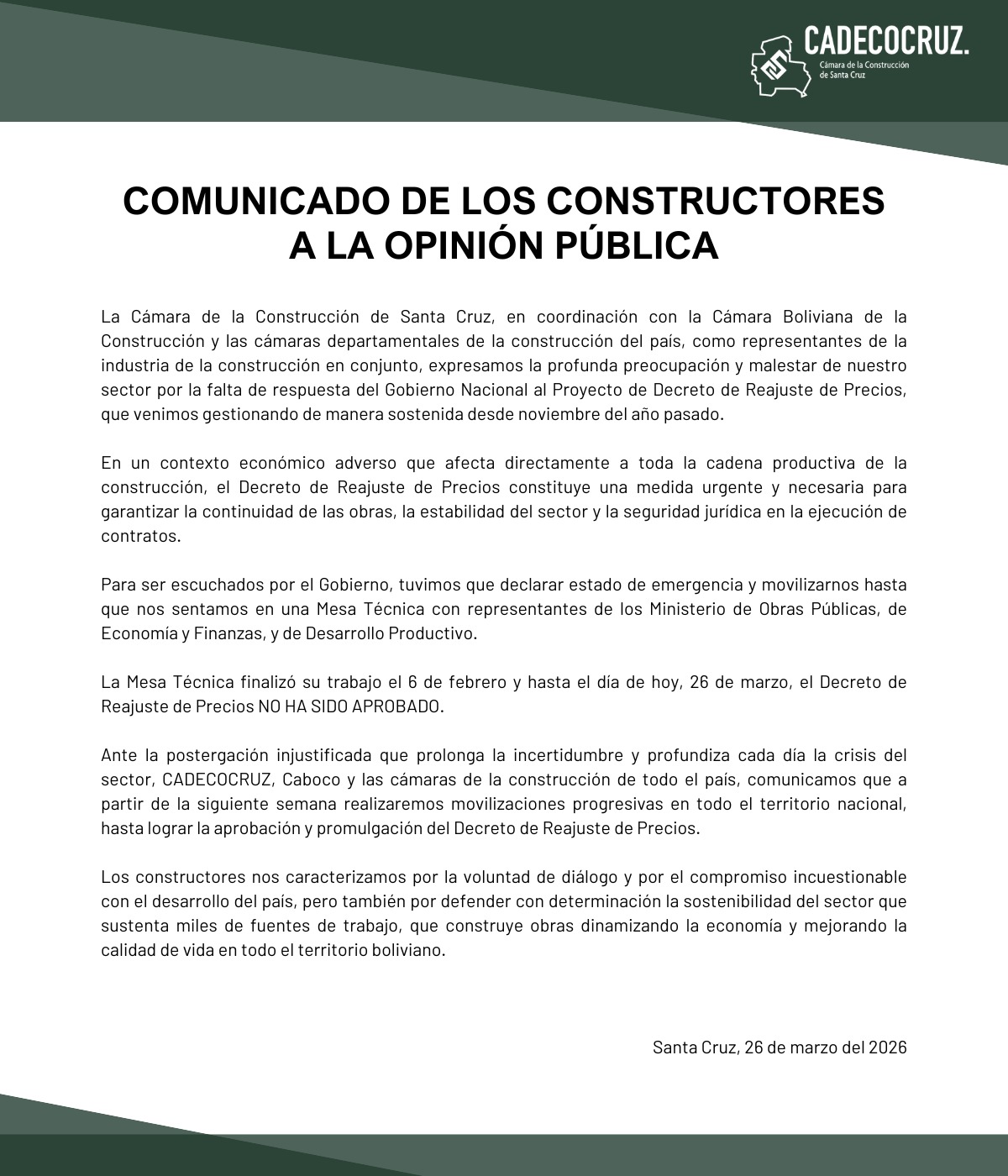 COMUNICADO DE LOS CONSTRUCTORES A LA OPINIÓN PÚBLICA