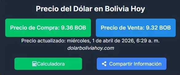 De acuerdo con el sitio dolarboliviahoy.com, la moneda estadounidense se ubica en Bs 9,36 para la compra y Bs 9,32 para la venta.