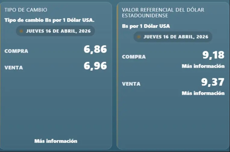 Asimismo, el valor referencial del dólar publicado por el ente emisor se ubica en Bs 9,18 para la compra y Bs 9,37 para la venta, cifras que contienen una diferencia a comparación de las cotizaciones observadas en el mercado informal.